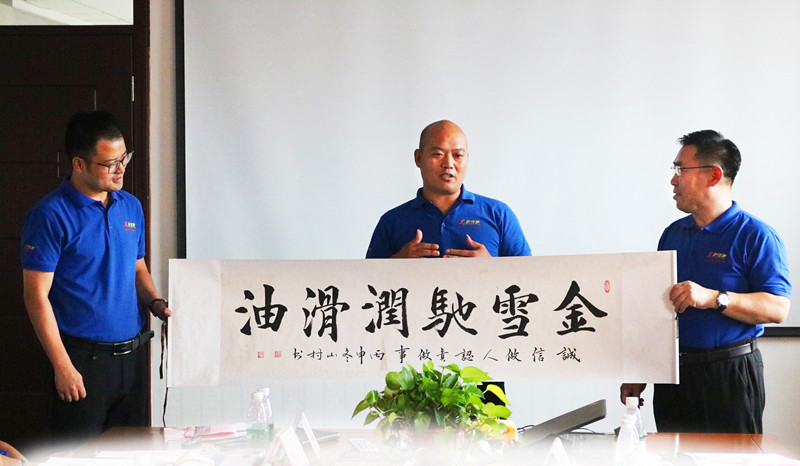 會(huì)上,南陽(yáng)薛書(shū)峰為金雪馳送來(lái)了一份特別的禮物,南陽(yáng)市書(shū)法家協(xié)會(huì)的山村先生為金雪馳手書(shū)“金雪馳潤(rùn)滑油,誠(chéng)信做人,認(rèn)真做事”的書(shū)法作品,山村先生是金雪馳潤(rùn)滑油的忠實(shí)客戶,聽(tīng)聞薛總要來(lái)金雪馳,堅(jiān)持手書(shū)作品,托薛總帶來(lái)。感謝山村先生的認(rèn)可和青睞,“誠(chéng)信做人,認(rèn)真做事”是對(duì)金雪馳“信譽(yù)重于利益”企業(yè)文化的高度認(rèn)可,金雪馳亦會(huì)更加努力,腳踏實(shí)地,一步一個(gè)腳印,勇往直前,不負(fù)客戶們的殷切期望。
