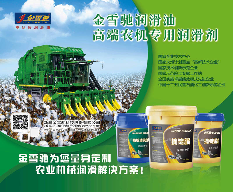 隨著新疆棉花成熟期的臨近,一年一度的采棉機工作即將開始,為了用戶更好地維護采棉設(shè)備,確保機器在采季作業(yè)時保持最佳的工作狀態(tài),新疆金雪馳科技股份有限公司烏市生產(chǎn)基地生產(chǎn)的金雪馳采棉機專用潤滑產(chǎn)品已陸續(xù)到達各經(jīng)銷商庫房,應(yīng)用于全疆各建設(shè)兵團、農(nóng)場、農(nóng)戶的農(nóng)機產(chǎn)品上,獲得了用戶們的廣泛贊譽。金雪馳采棉機潤滑劑系列產(chǎn)品以卓越的產(chǎn)品性能為采棉作業(yè)保駕護航。