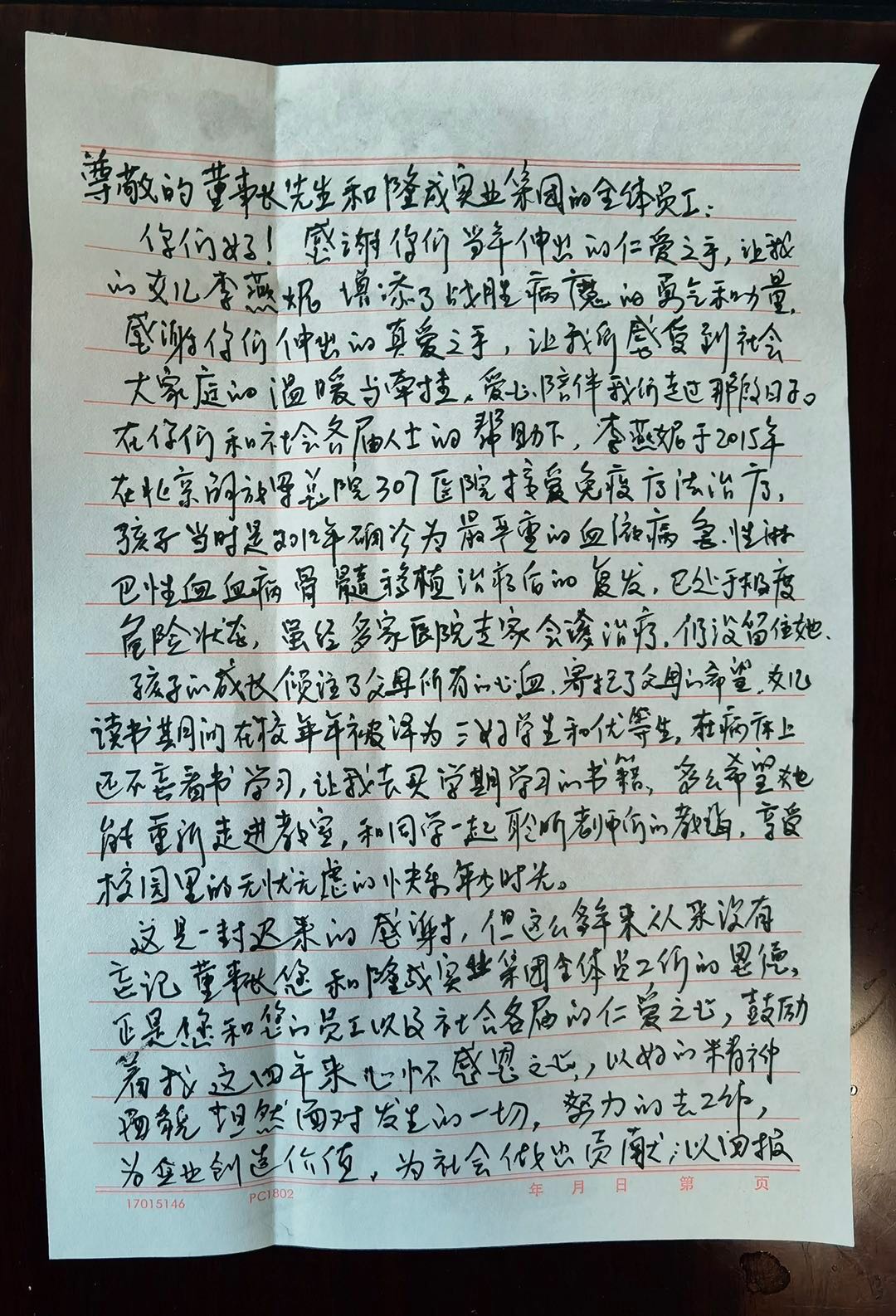 事由:金雪馳愛心基金于2012年援助了李先生,李先生女兒在2012年被確診為白血病,曾接受骨髓移植后又復(fù)發(fā),2015年在北京解放軍總院接受治療時(shí)已處于極度危險(xiǎn)狀態(tài),隨后經(jīng)過(guò)多家醫(yī)院的專家會(huì)診治療,最終還是沒能將孩子的生命挽救回來(lái),當(dāng)年在求醫(yī)路上接受到“金雪馳愛心基金”的捐助,一直對(duì)董事長(zhǎng)劉輝先生和隆成實(shí)業(yè)的全體員工存有感恩之心,今日登門拜訪,并送上感謝信和答謝禮。董事長(zhǎng)親切的接待了李先生也回贈(zèng)于他金雪馳紀(jì)念品,董事長(zhǎng)對(duì)李先生女兒的遭遇表示不幸,并表示了隆成集團(tuán)對(duì)他的幫助是我們做企業(yè)人的社會(huì)責(zé)任,也希望“金雪馳愛心基金”今后能夠幫助到更多的人和事。