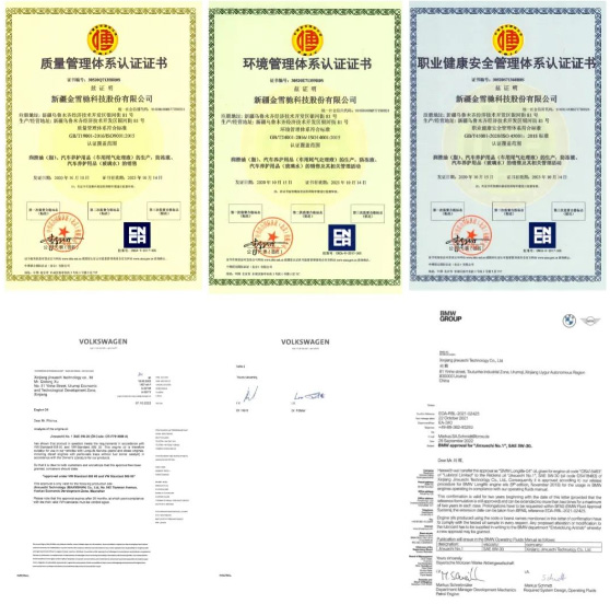 更高標準,生機勃發(fā)。2020年,金雪馳多款產品通過美國石油協(xié)會(API)SP以及國際潤滑劑標準化及認證委員會(ILSAC)GF-6A環(huán)保節(jié)能的國際權威認證證書,憑借國際領先的潤滑技術研發(fā)實力,金雪馳成為國際首批獲得此認證的潤滑油企業(yè)。2021年,金雪馳1號0W-20產品通過奔馳MB 229.71認證,再次驗證了金雪馳潤滑油達到了國際相關技術、參數與指標的過硬要求。?2022年,金雪馳首發(fā)滿足國六排放標準、具有更長換油周期的C系列產品,獲得市場認可,產品暢銷全國終端門店;金雪馳1號獲得BMW Longlife-04標準認證,金雪馳風電齒輪油Synnosynth LY PAO 320 獲得FLENDER(弗蘭德)認證;金雪馳藍油全合成0W-20通過大眾VW 508 00/VW 509 00標準認證。作為潤滑油的品質堅守者,金雪馳始終堅持以技術為核心驅動,通過技術融合、創(chuàng)新、延伸來打造優(yōu)質產品,從而實現品牌和企業(yè)的可持續(xù)發(fā)展。
